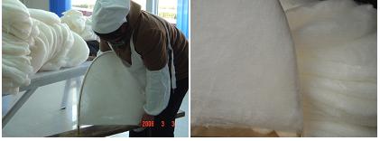 Bu işlemin ardından, U şeklindeki ipek kümeleri, deneyimli 2 çalışan tarafından karşılıklı geçilerek 30cm*80cm ebatlarında ipek katmanları oluşturulur.Bu ipek katmanları son derece güçlü ve dayanıklıdır. Öyle ki dolgu malzemesi 2 yetişkin tarafından karşılıklı çekiştirilse bile dolgu malzemesi kopmaz. Her bir yorgan imalatı için, yorganın ipek dolgusunun yoğunluğuna göre 200-400 adet arasındaipek kümeleri kullanılır.